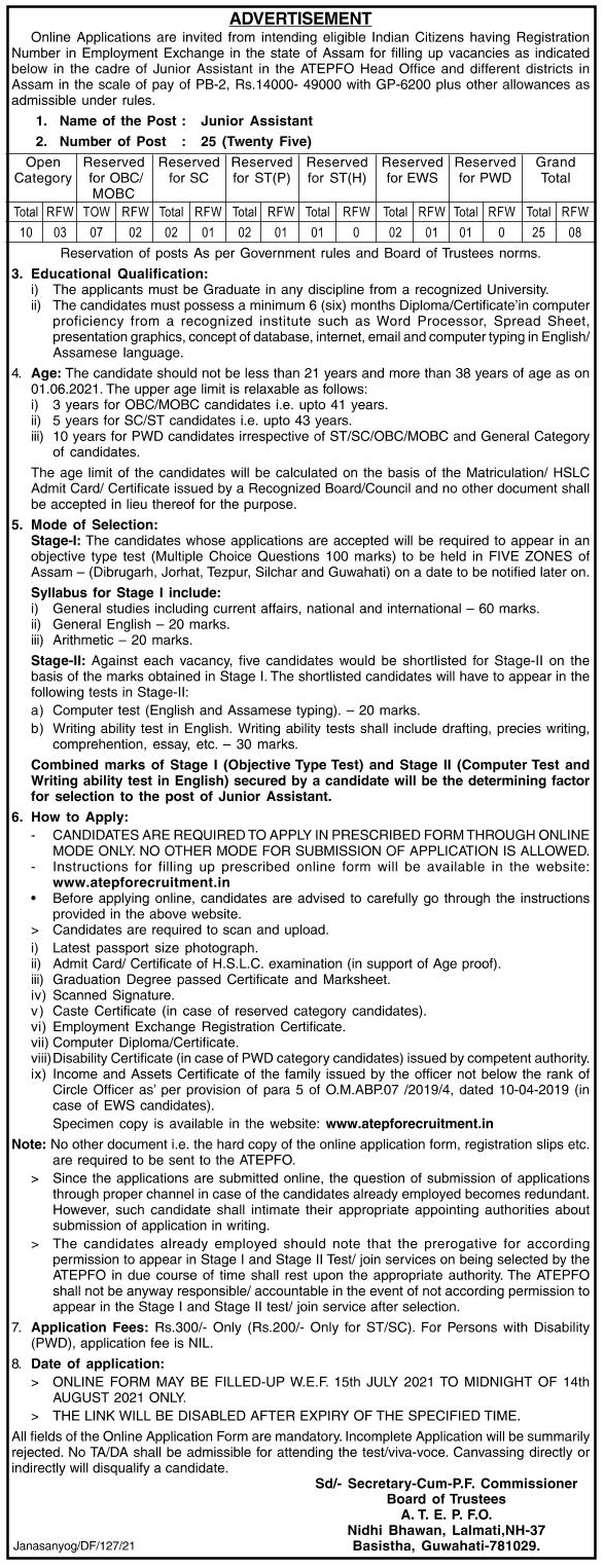 আসম চা কর্মচাৰী প্রভিডেন্ট ফান্ড অর্গানাইজেশন (এটিইপিএফও) এটিইপিএফও প্রধান কার্যালয়ত আৰু বিভিন্ন জিলাতে অসমৰ বিভিন্ন জেলাতে ২৫ জুনিয়ৰ চৰকাৰী নিয়োগৰ কাৰণে নাগৰিকৰ অসমৰ পৰা অনলাইনে আবেদন কৰাৰ আহ্বান জনাইছে।